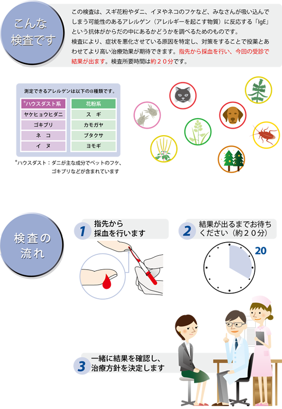 指先からの採血により20分で結果がわかるアレルギー検査です。小さなお子様でも簡単に検査できます。