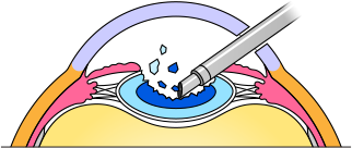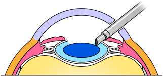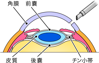術者によって水晶体を吸引除去し、眼内レンズを挿入するための切開創を作成します。