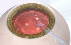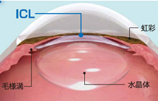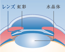 水晶体のピント調節機能を残したまま、ICLと呼ばれる眼内レンズを虹彩と水晶体の間にインプラントする術式です。
