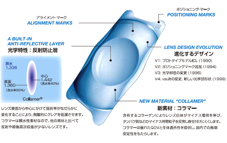 生体適合性に優れた新素材「コラマー」を採用。1997年から欧州で発売を開始し、全世界で300,000眼以上インプラントされています。初めてインプラントされてから14年以上の長期実績があります。