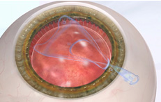 ※切開創は3㎜と小さいため、縫合の必要はありません。術後はしばらく抗菌点眼をする必要がありますが、創口はすぐに塞がり自然治癒します。 インジェクターという挿入器を使って、切開した部分から細長く筒状に折りたたんだレンズ(ICL)を挿入します。